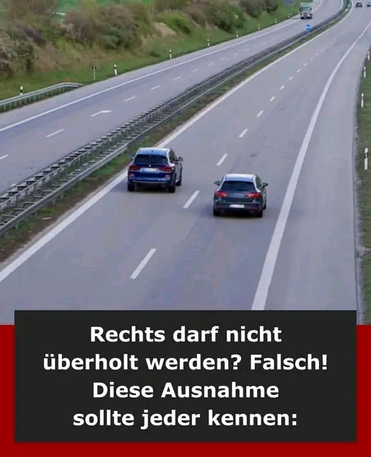 Wenn ein Auto von der Autobahn oder einer Kraftfahrstraße abbiegt, dürfen Fahrzeuge auf der durchgehenden Fahrbahn rechts überholen – jedoch nur, wenn die abgehenden Fahrstreifen durch eine breite Leitlinie getrennt sind. Auf Ausfädelungsstreifen oder Verzögerungsstreifen, die nicht durch eine breite Leitlinie abgegrenzt sind, ist das Überholen rechts nicht erlaubt.